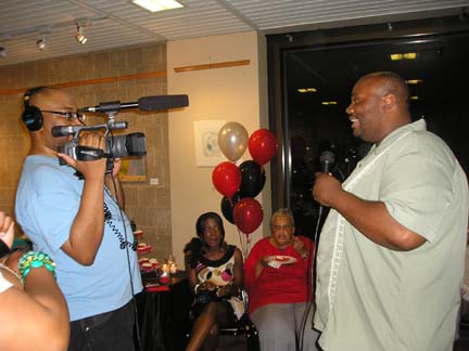 Speaking of short, I think the women in attendance thought they were auditioning for another season of VH1’s reality show Real Chance of Love. Skin tight dresses barely covering thighs and hooker heels was the main attire of the evening (sorry no example pic). I suppose they decided a movie about internet dating might lead to some off-line meeting and greeting. I didn’t get the memo, I arrived in jeans, although paired with a really cute new spring blouse. I also met up with an old friend, Cindy Wood (see pic) she didn’t get the memo either to dress for a club scene. She’s pictured with yet another person associated with this film, Lloyd Booker. I swear, this film has producers, associates and partners coming out of the woodwork; even after going to the website, I can’t get it straight as to everyone’s involvement in the film, but it does take a village.